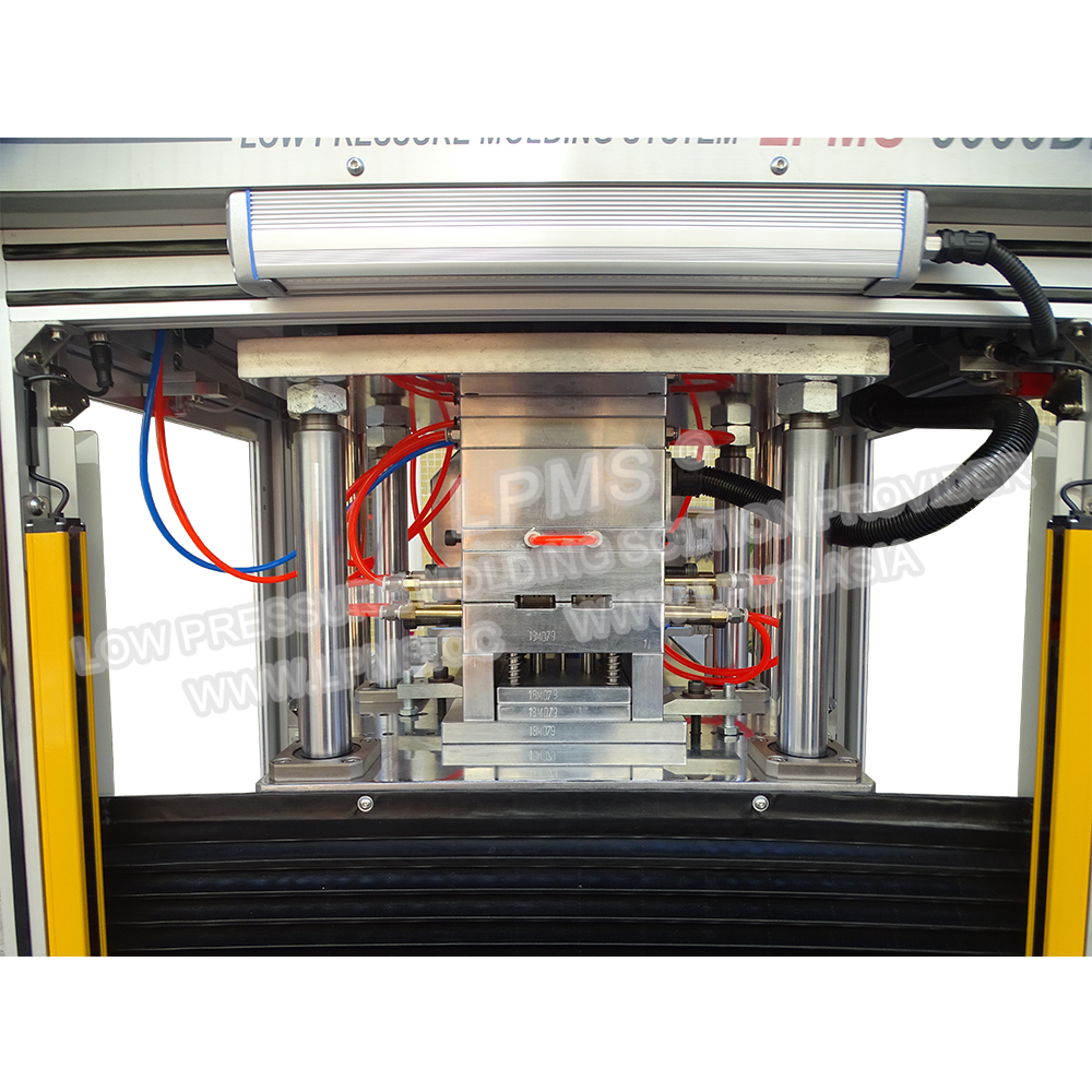 l 合模采用氣液增壓缸,適合注膠麵積較大、注膠量大產品的(de)大批(pī)量生產。